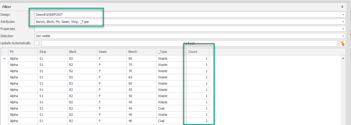 - Selet the attributes that correspond to the Spry Data Tables Levels + the material attributes if one is being used (Material attributes are an optional way to determine which specific fields within a record to write to. For example we could use one to write a waste solid with waste attributes and a coal solid with coal attributes to different fields within the same record)