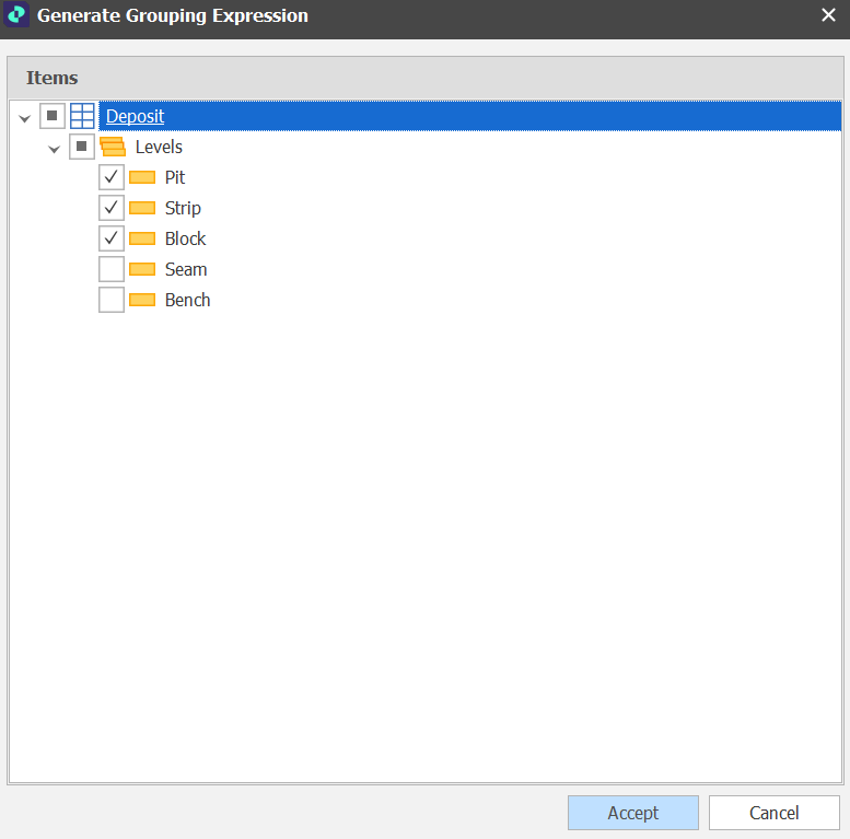 - Grouping Expression - Text(Pit) + "\\" + Text(Strip) + "\\" + Text(Block).
